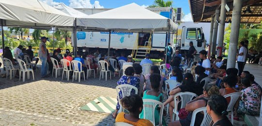 Pra todos verem: No primeiro plano da imagem, várias pessoas aguardam sentadas em cadeiras brancas pelo atendimento eleitoral. Ao fundo, o caminhão do ‘TRE em Todo Lugar’ encontra-se estacionado para a prestação dos serviços ao público.